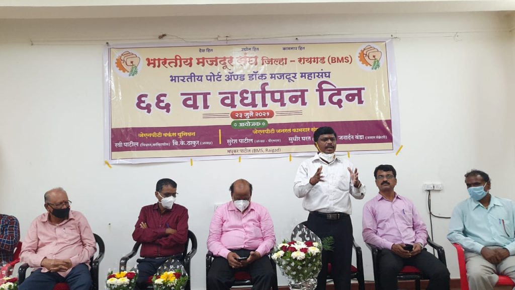 JNPT टाऊनशीपमध्ये भारतीय मजदूर संघाचा 66 वा वर्धापनदिन साजरा करण्यात आला. या कार्यक्रमाचे प्रमुख पाहुणे महाराष्ट्राचे BMS चे नवनिर्वाचित अध्यक्ष अँड अनिल डुमणे, कार्यक्रमाचे अध्यक्ष जिल्हा अध्यक्ष तथा पोर्ट महासंघाचे सरचिटणीस सुरेश पाटील, मुंबई BMS चे अध्यक्ष बापू दडक,जेष्ठ कामगार नेते राम भगत, माजी विस्वस्त रवी पाटील, महासंघाचे राष्ट्रीय खजिनदार सुधीर घरत, युनियनचे सरचिटणीस जनार्दन बंडा, नवनिर्वाचित रायगड जिल्हा उपाध्यक्ष मधुकर पाटील तसेच कामगार व महिला मोठ्या संख्येने उपस्थित होत्या.